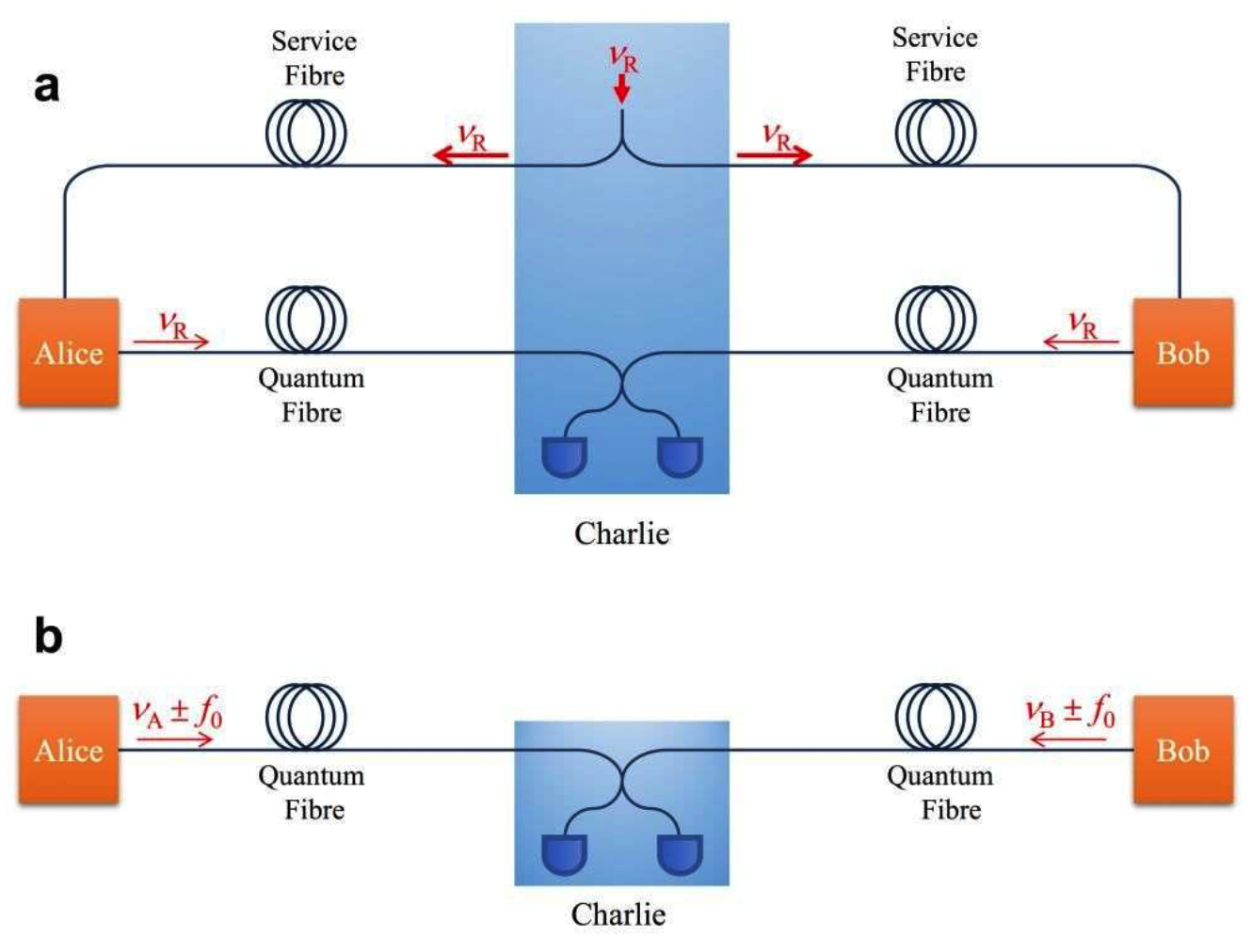 北京量子信息科學(xué)研究院首席科學(xué)家袁之良介紹,雙場架構(gòu)下量子通信,需要相距遙遠(yuǎn)的兩個獨立激光源各自發(fā)出“信號”。如果激光源發(fā)射的“信號”頻率不同,就會出現(xiàn)傳輸中的“信號”失誤。想要避免“信號”失誤,就需要一個能實現(xiàn)兩端“信號”頻率相同的“工具”:服務(wù)光纖。這意味著通信兩端之間還需額外架設(shè)“一條路”,這也就構(gòu)成了由“兩條路”構(gòu)成的傳統(tǒng)架構(gòu)。